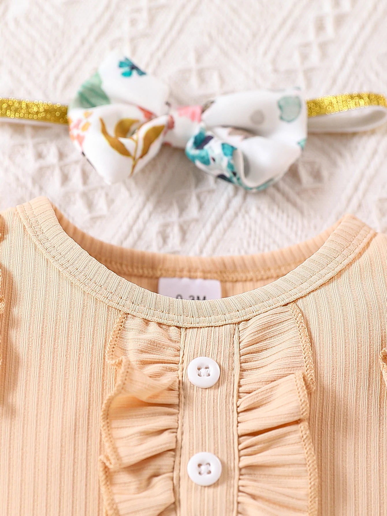 This bold 3-piece summer set by Mioglrie features a ruffled short-sleeve bodysuit, floral printed shorts, and a matching headband designed for baby girls aged 0-18 months.