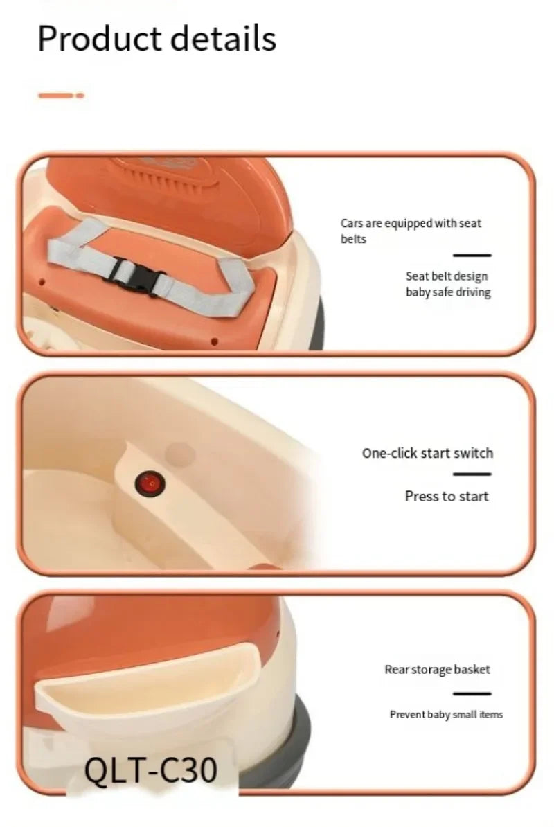 Easy to start with just one key, this car also has a rear storage basket to hold all of the baby's essentials.