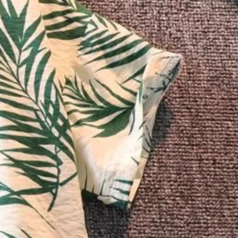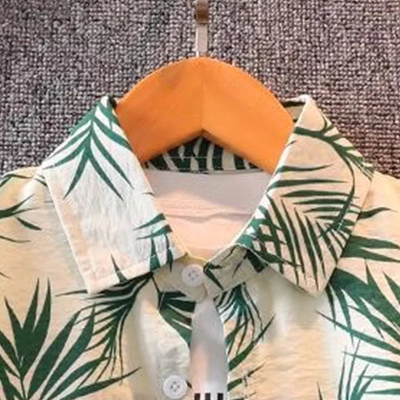 This boys’ summer set features a short-sleeved shirt and matching shorts, designed with bold floral prints for a standout beachside look.