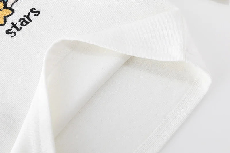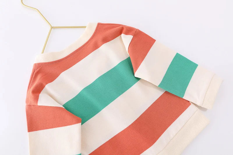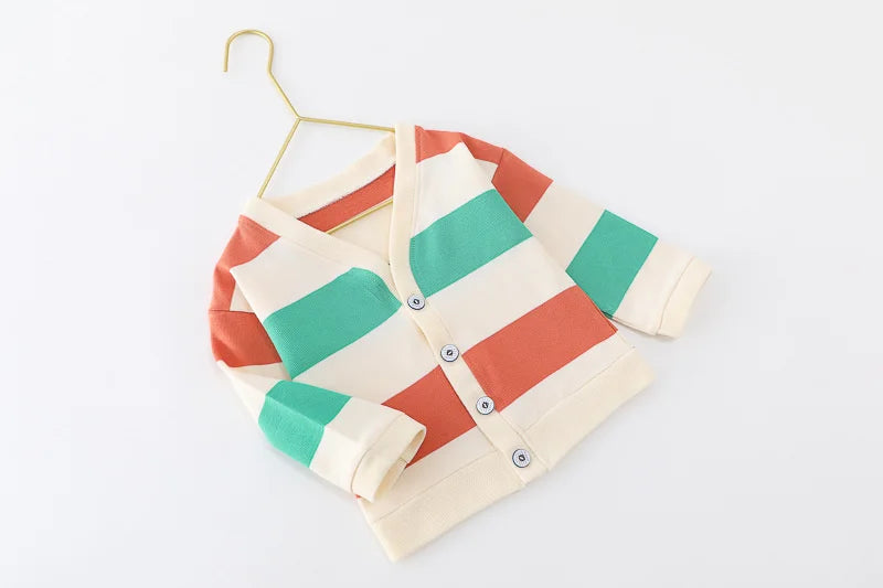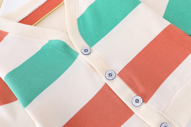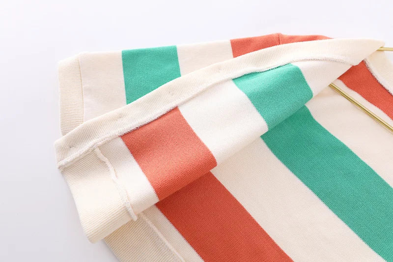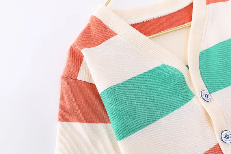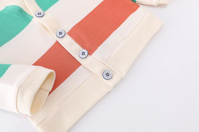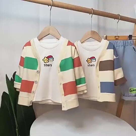 Featuring a casual single-breasted jacket, a striped V-neck t-shirt, and comfy pants, this knit outfit combines cotton and polyester for all-day comfort. Designed for kids aged 1 to 6 years with a smaller fit, this tracksuit brings effortless style and playful vibes to every outing.